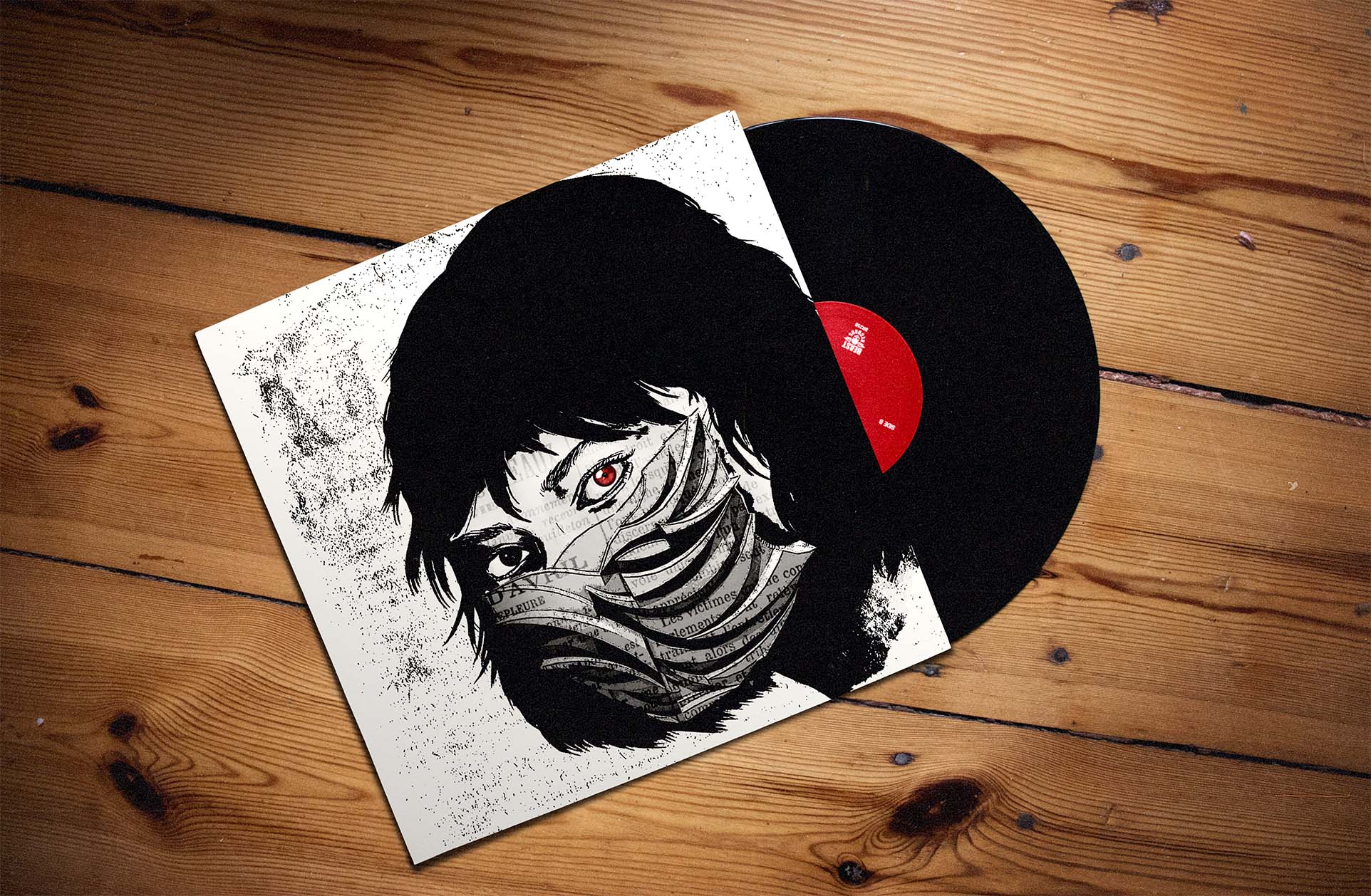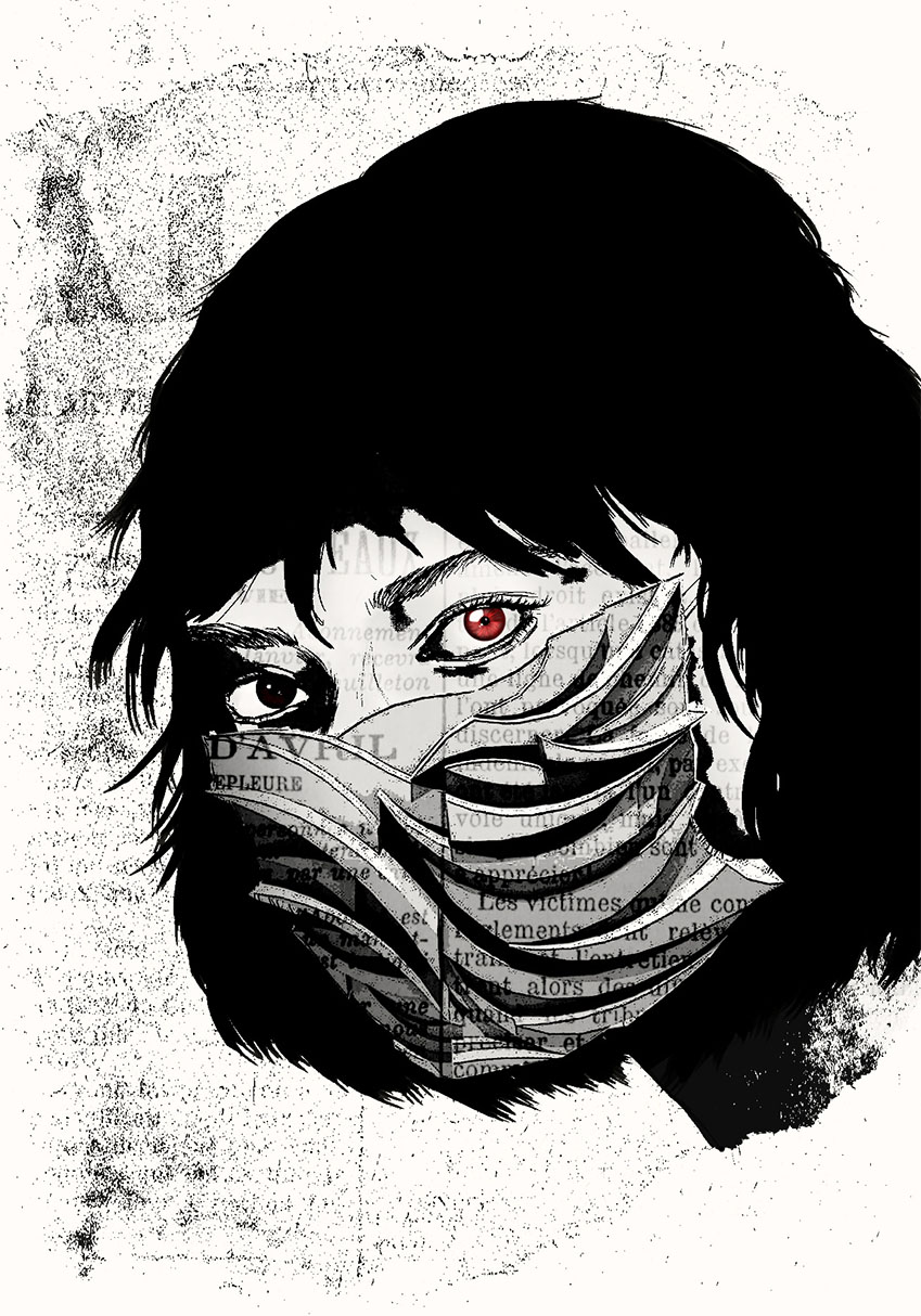 is a combination of a watercolor paint with a 3D model of a medical mask. The texture covering the whole artwork is an excerpt from a newspaper, highlighting the climate of fear and anxiety that prevailed during the COVID period. Created to be printed out, the artwork has been converted into a vinyl mock-up.