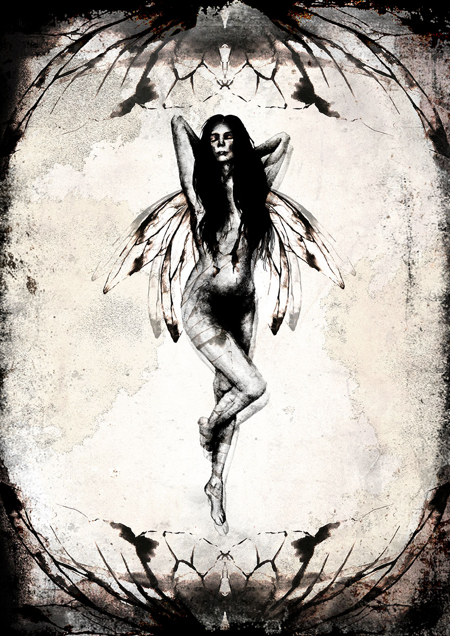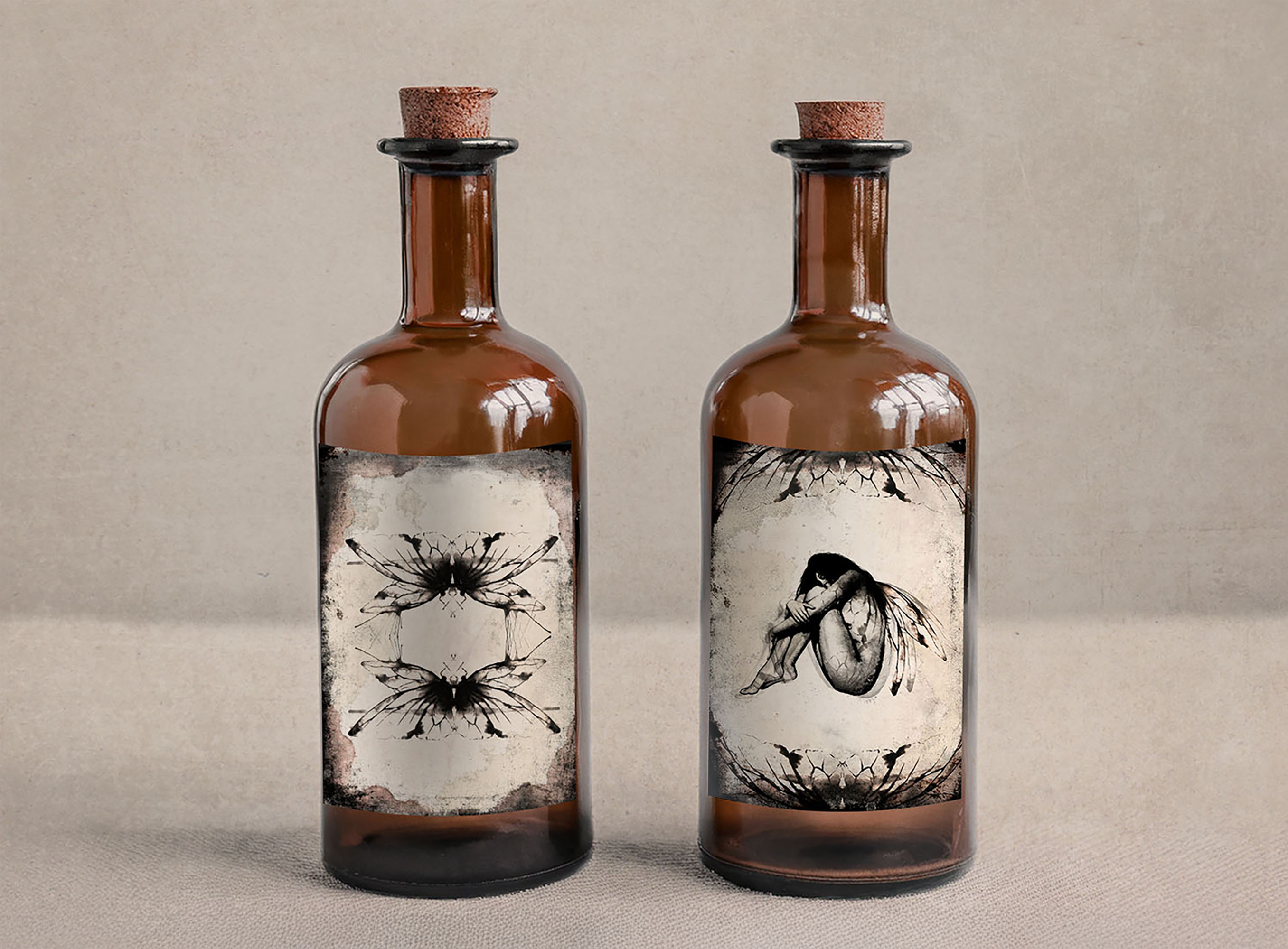 is a series of three prints inspired by Art Nouveau and fairy motifs. It mixes watercolor painting with digital textures and post-production. Two imaginary liquor bottles have been imagined, using the original artworks as labels.
