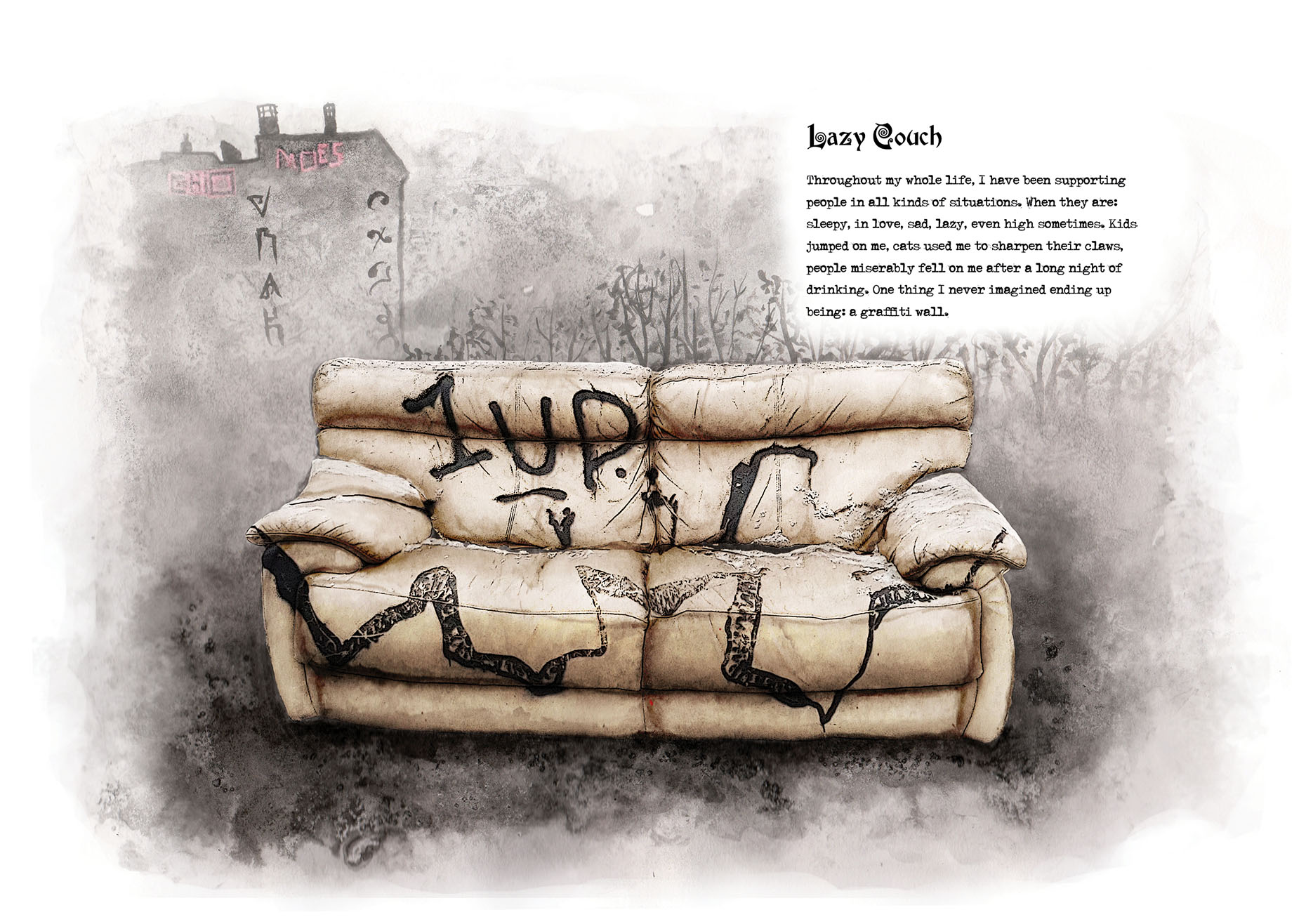 is drawing reportage that captures objects left in the street of Berlin and their emotions. Through short fictional stories, the book offers another kind of perspective on the way objects might feel when being abandoned in the street, drawing a parallel to the loneliness that can be felt when living in a city.